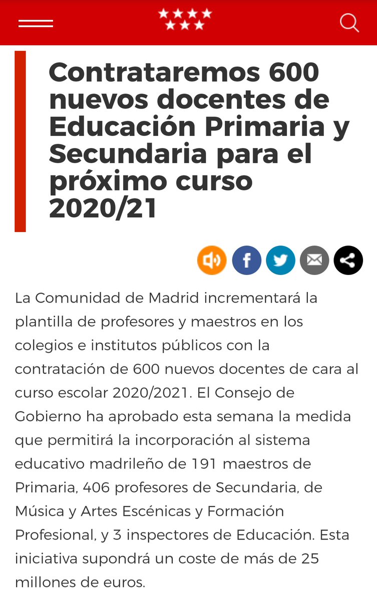 Con COVID19 surge la contratación de docentes para bajar ratio y se anuncia para curso 2020/21 un incremento de 10610 docentes en Madrid (7948 docentes en la educación pública y 2662 docentes de privados con concierto). Me centro en Madrid e intento documentar datos de número de docentes y su variación, y estimar su variación con la información disponible. El objetivo es tener una estimación junto al procedimiento para obtenerla, de modo que se pueda validar la realidad de ese variación, del INCREMENTO que es lo que anuncia Madrid, no anuncia ese número de contrataciones.